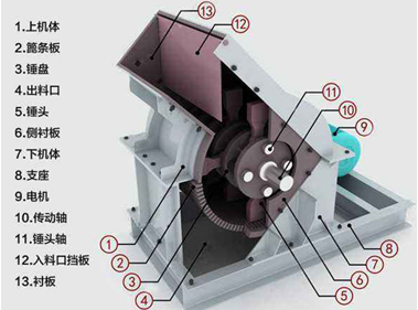 錘式破碎機(jī)是靠懸掛在轉(zhuǎn)子上的活動(dòng)錘頭由轉(zhuǎn)子帶動(dòng)轉(zhuǎn)子高速轉(zhuǎn)動(dòng)用沖擊力打擊物料,達(dá)到破碎的目的。